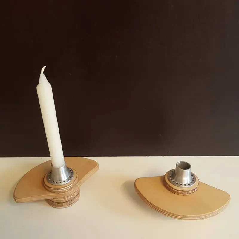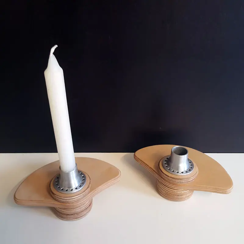 Nachhaltige Kerzenständer, da aus aufbereiteten Altmaterialien gefertigt und für eventuelle spätere Weiterverwendung im Handumdrehen in Einzelteile zerlegbar.