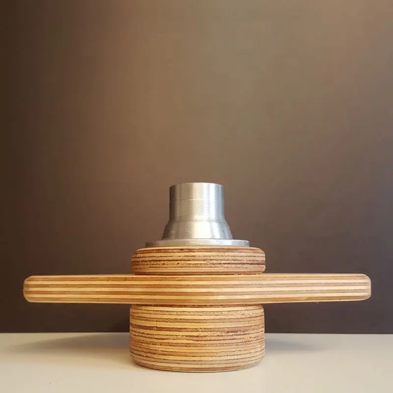 In diesem Fall handelt es sich um Birke Multiplex, mit je einer halben Fahrradnabe kombiniert.