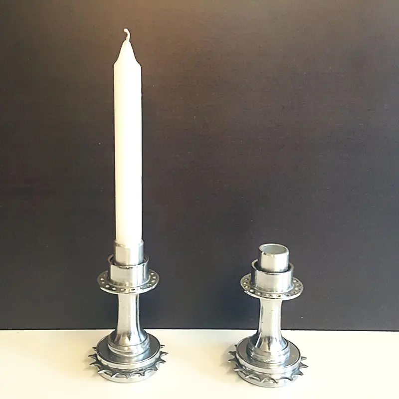 Basis dieser einzigartigen Kerzenhalter ist jeweils eine ausrangierte Fahrradnabe, kombiniert mit anderen Fahrradteilen.