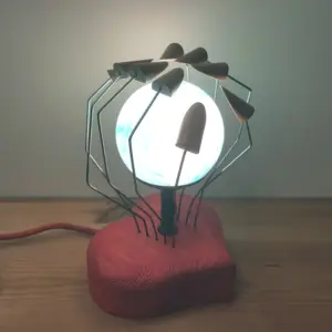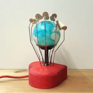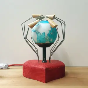 Der gläserne Lampenschirm stellt unseren Planeten dar und wird von morbiden Händen aus Fahrradspeichen und Buche umschlossen.
