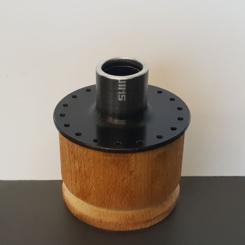 In dessen Mitte wurde eine halbe Fahrradnabe integriert.
